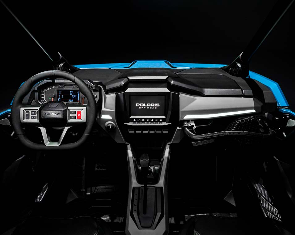 - RIDE COMMAND® 7” Glove-Touch Display: DYNAMIX 2.0 Visualizer, Built-In GPS, Group ride (cell-based or GPS based), Topographic Mapping, Bluetooth & USB Smartphone Connectivity, AM/FM & Weather Radio (Accessory Speakers Required - Sold Separately), In-Vehicle Communications Capable With Optional Sena Headsets, Polaris P.A.S.S Anti-Theft System. Dual-sweep Analog Dials w/ 4" LCD Rider Information Center: User Selectable Blue/Red Backlighting & Brightness, Programmable Service Intervals. Digital Instrumentation: Speedometer, Tachometer, Odometer, Tripmeter, Clock, Hour Meter, Gear Indicator, Fuel Gauge, Coolant Temperature, Voltmeter, Service Indicator and Codes, Seat Belt Reminder Light, Gear Indicator, DC Outlet.